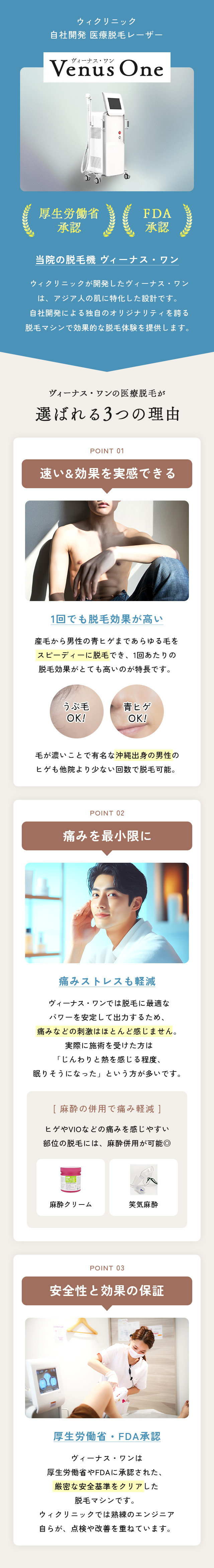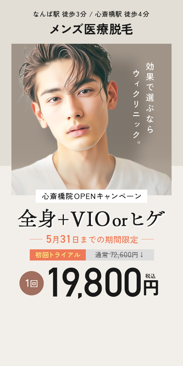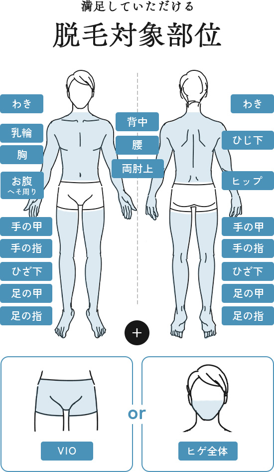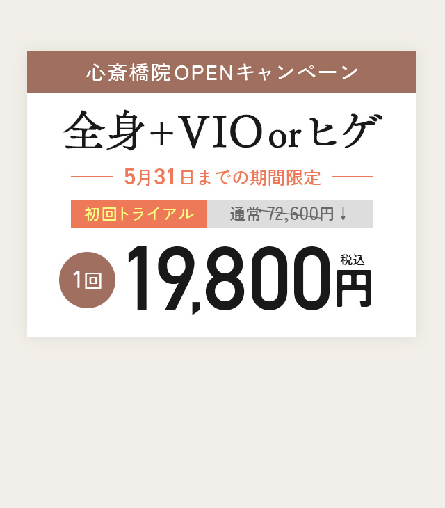 痛みはほとんどありませんが、VIOや髭は他の部位に比べて痛みを感じやすい傾向にあります。その場合も麻酔クリームや笑気麻酔(いずれも別料金)で痛みを軽減できるため、ご不安な方はお気軽にお申し付けください。
