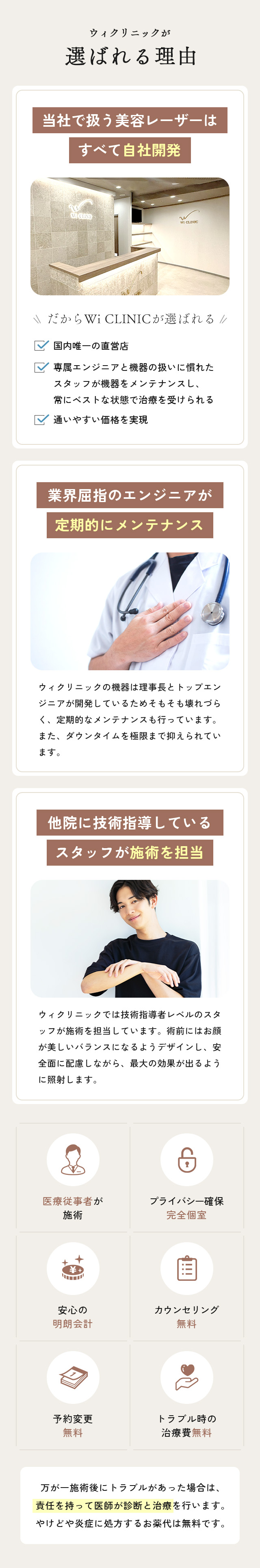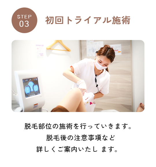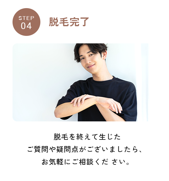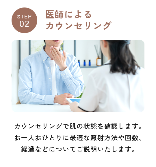 施術部位を怪我していたり湿疹や炎症が起きていたりする場合は、治るまで施術を控えていただきます。また下記にあてはまる方は、安全を考慮し脱毛をお断りする場合があります。・他院にて2週間以内にレーザーや注射などの治療を行っている方・1か月以内に手術を受けた方・光に反応しててんかん発作が起こる方・施術中に静止していることが困難な状況にある方・重度のご持病があり、現在も治療継続中の方ご不安がある方は、お気軽に医師にご相談ください。
